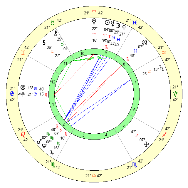 | Moon | 0 Aries -34 | 14 Aquarius 24 | 2 Leo 58 |