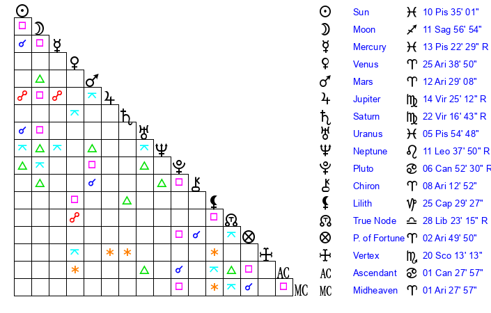 | Mercury | 13 Pisces 22 | 27 Pisces 26 | 16 Cancer 7 |