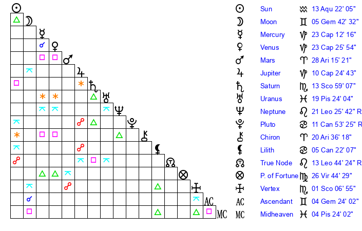 | Moon | 5 Gemini 44 | 9 Aries 21 | 2 Aquarius 16 |