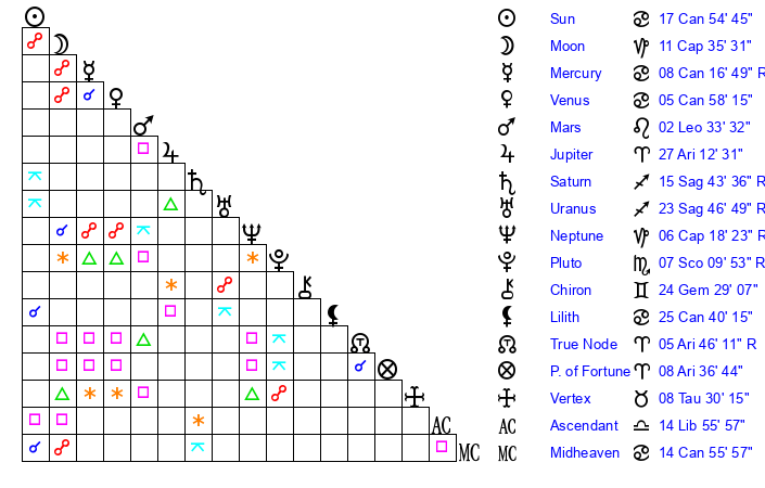 | Neptune | 6 Capricorn 17 | 2 Aries 9 | 5 Capricorn 27 |