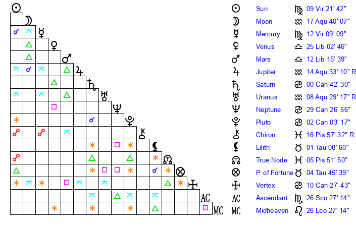 | Mercury | 12 Virgo 9 | 0 Virgo 17 | 22 Sagittarius 9 |