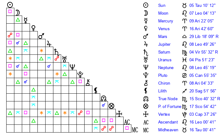 | Venus | 16 Aries 43 | 27 Pisces 32 | 25 Leo 43 |