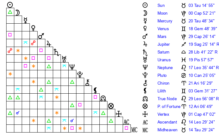 | Uranus | 19 Pisces 58 | 25 Taurus 56 | 20 Pisces 59 |