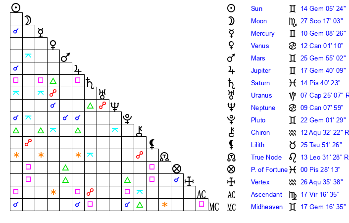 | Sun | 14 Gemini 6 | 15 Gemini 17 | 8 Libra 35 |