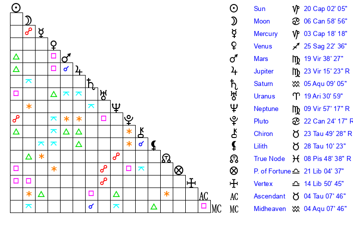 | Mercury | 3 Capricorn 18 | 3 Capricorn 16 | 26 Pisces 32 |