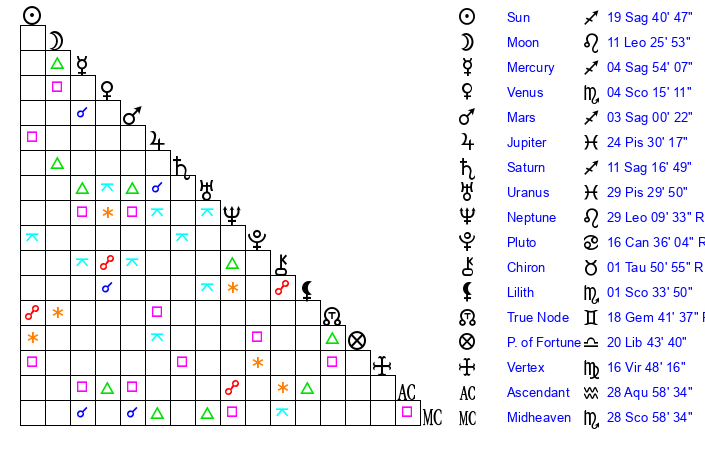 | Saturn | 11 Sagittarius 39 | 13 Pisces 16 | 19 Sagittarius 25 |