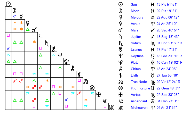 | Sun | 13 Pisces 52 | 14 Pisces 22 | 22 Gemini 22 |
