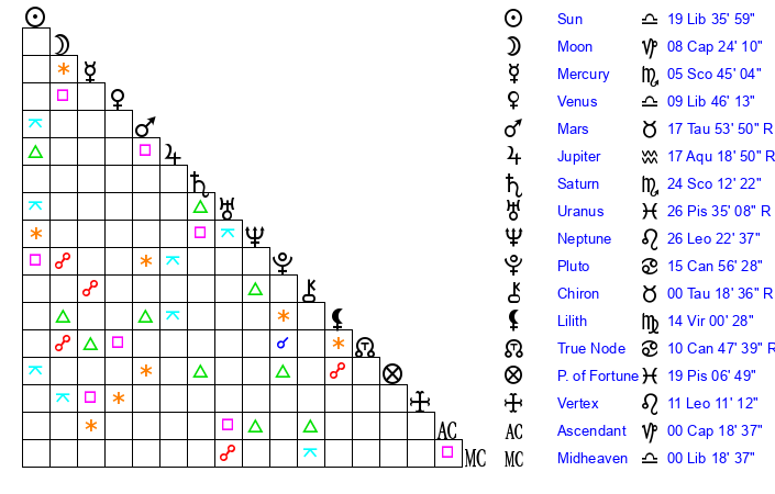 | Sun | 19 Libra 36 | 20 Libra 36 | 29 Capricorn 40 |