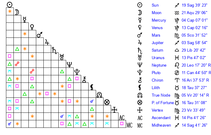 | Sun | 19 Sagittarius 39 | 20 Sagittarius 55 | 2 Aries 48 |