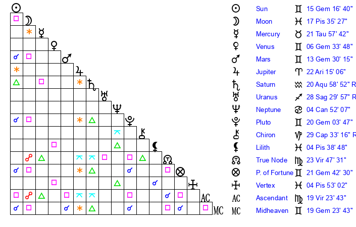 | Pluto | 20 Gemini 5 | 3 Aquarius 34 | 21 Gemini 42 |