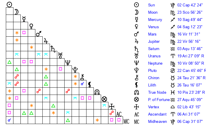 | Moon | 24 Scorpio 7 | 22 Libra 30 | 12 Aries 3 |