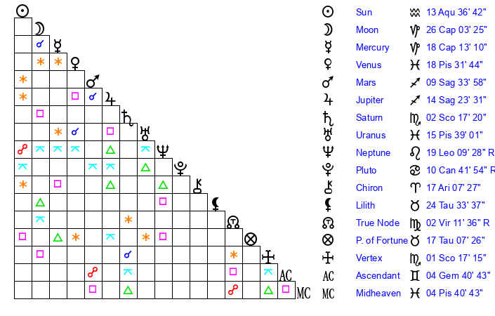 | Sun | 13 Aquarius 37 | 15 Aquarius 7 | 23 Taurus 36 |