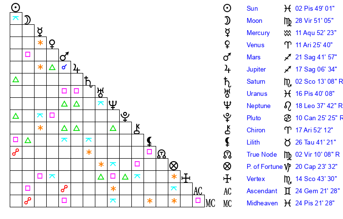 | Sun | 2 Pisces 49 | 4 Pisces 19 | 11 Gemini 51 |