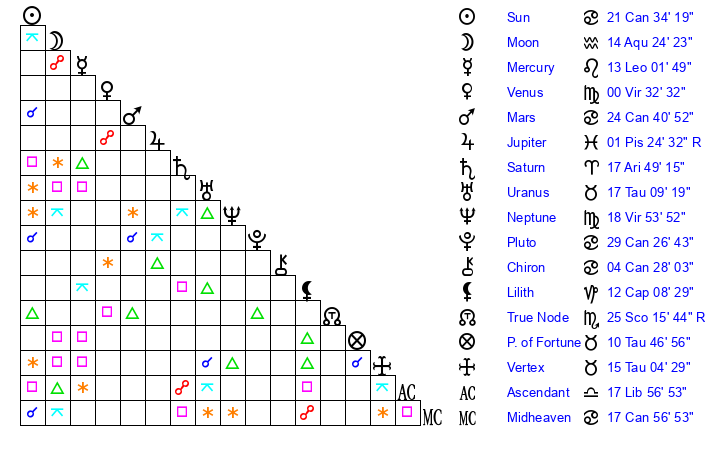 | Moon | 14 Aquarius 27 | 9 Pisces 42 | 19 Aries 32 |