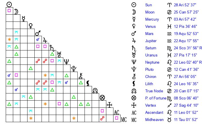 | Saturn | 25 Scorpio 3 | 26 Pisces 34 | 19 Scorpio 56 |