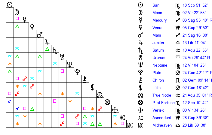 | Sun | 18 Scorpio 52 | 19 Scorpio 33 | 22 Aquarius 18 |