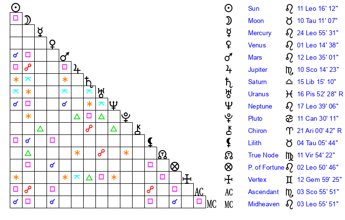 | Sun | 11 Leo 16 | 12 Leo 34 | 21 Scorpio 18 |