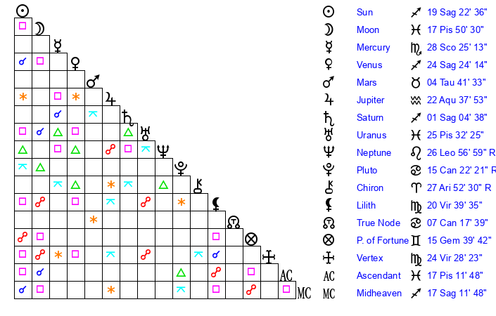 | Saturn | 1 Sagittarius 30 | 13 Pisces 15 | 8 Sagittarius 6 |
