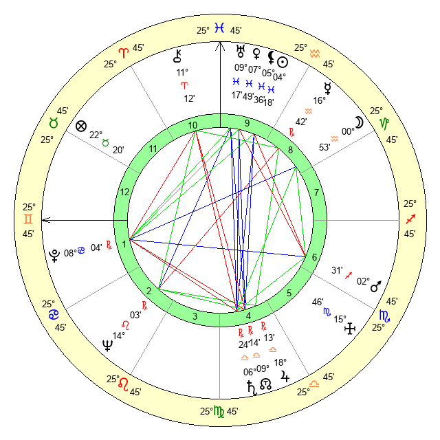| Sun | 4 Pisces 19 | 5 Pisces 20 | 15 Gemini 11 |