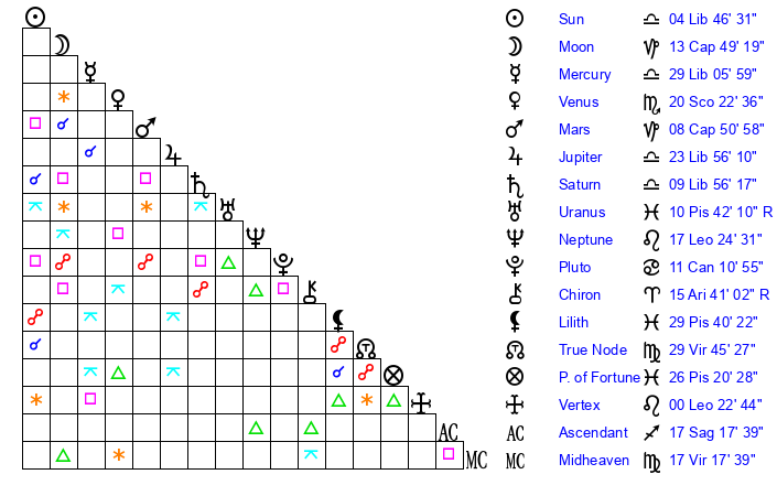 | Saturn | 10 Libra 32 | 27 Pisces 49 | 20 Libra 23 |