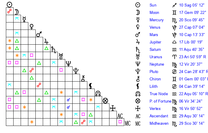 | Sun | 10 Sagittarius 5 | 10 Sagittarius 46 | 13 Pisces 26 |