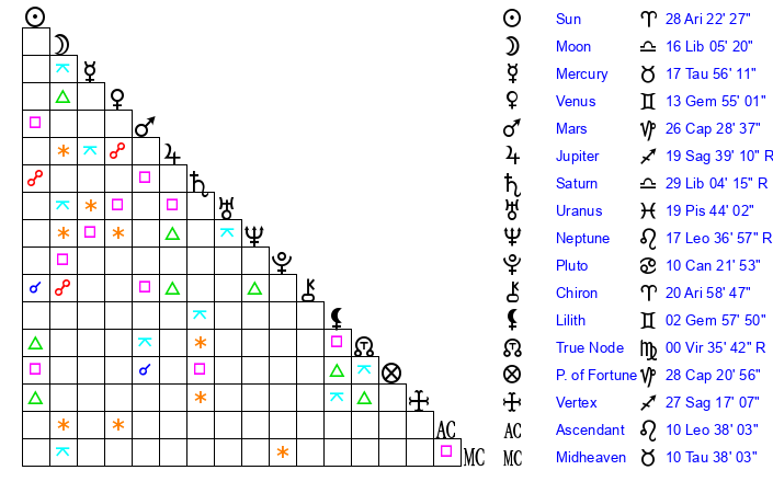| Neptune | 17 Leo 36 | 0 Aries 41 | 19 Leo 32 |