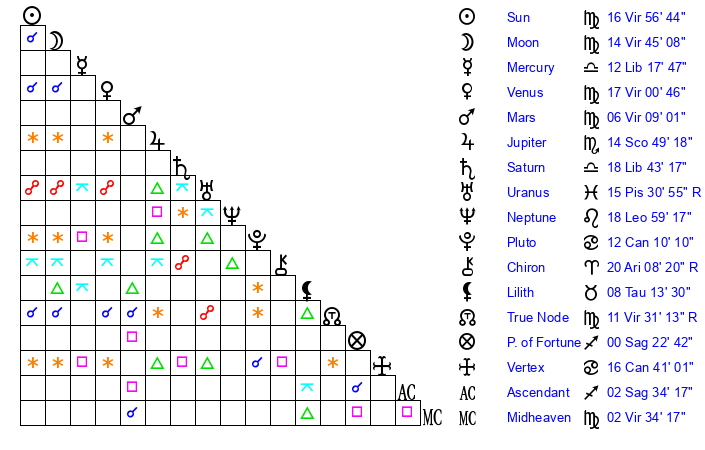 | Moon | 14 Virgo 43 | 27 Aries 58 | 10 Gemini 58 |