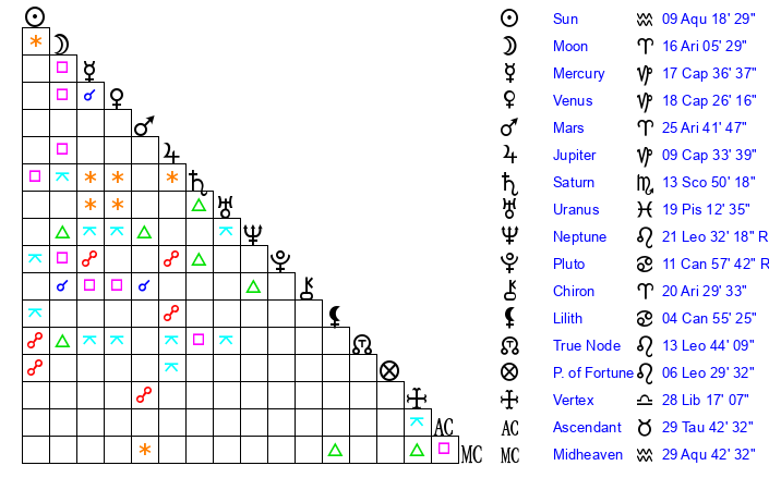 | Moon | 16 Aries 7 | 12 Aquarius 20 | 3 Sagittarius 56 |