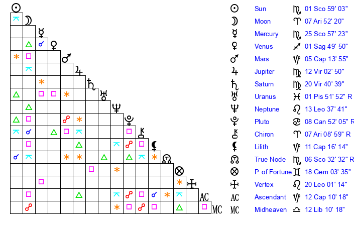 | Moon | 7 Aries 52 | 18 Sagittarius 11 | 14 Aquarius 56 |