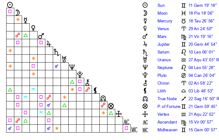 | Sun | 11 Gemini 19 | 12 Gemini 24 | 23 Virgo 58 |