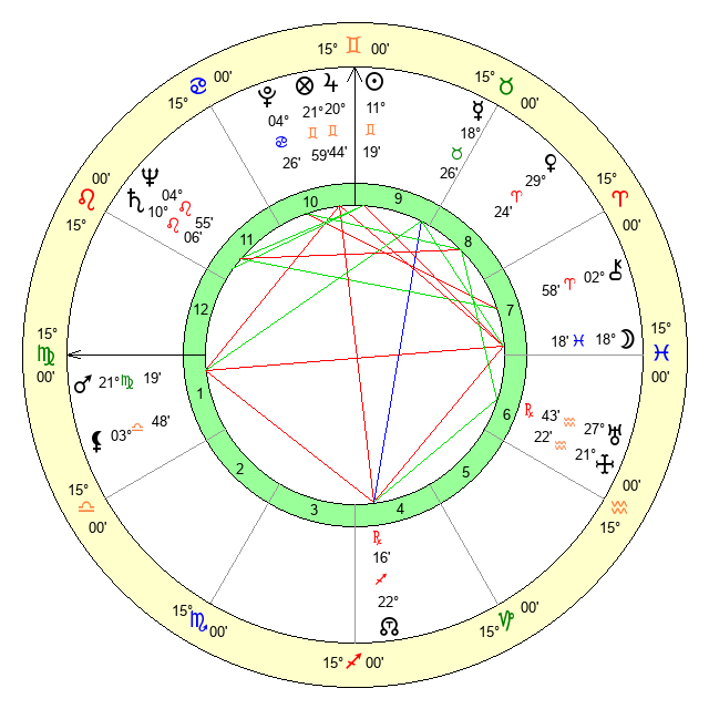 | Moon | 18 Pisces 16 | 7 Virgo 26 | 14 Aquarius 31 |
