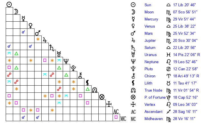| Saturn | 22 Libra 55 | 26 Pisces 52 | 2 Scorpio 33 |