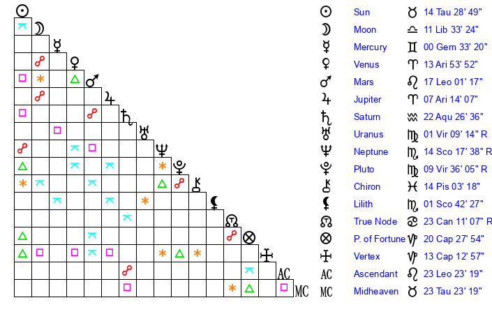 | Venus | 13 Aries 54 | 3 Aries 2 | 29 Gemini 4 |