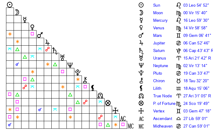 | Mercury | 17 Leo 0 | 12 Leo 6 | 1 Scorpio 50 |