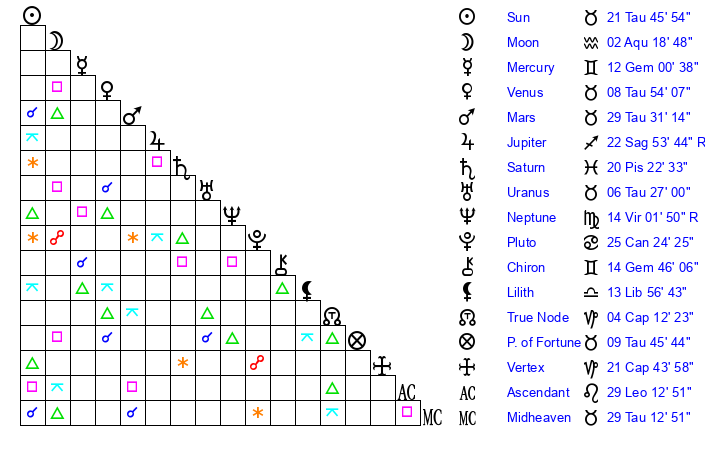 | Moon | 2 Aquarius 16 | 22 Scorpio 14 | 14 Taurus 35 |