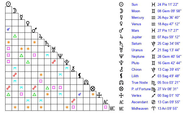 | Pluto | 16 Gemini 43 | 3 Aquarius 14 | 19 Gemini 0 |