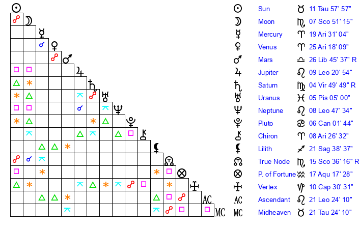 | Sun | 11 Taurus 58 | 12 Taurus 32 | 22 Leo 31 |