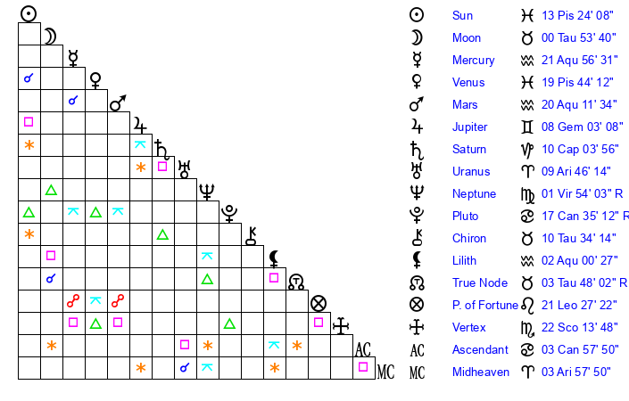 | Venus | 19 Pisces 45 | 10 Aries 41 | 16 Cancer 17 |