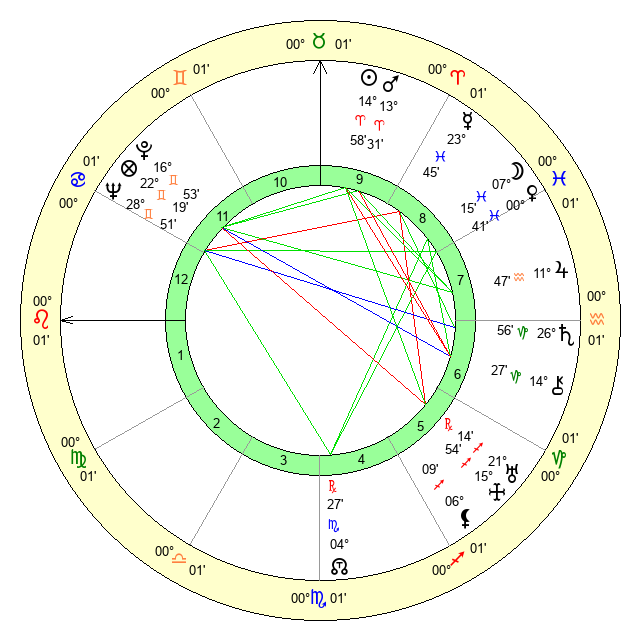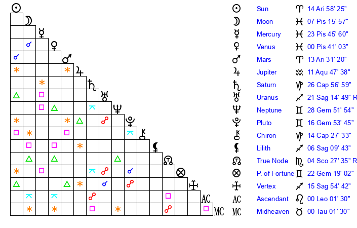 | Sun | 14 Aries 58 | 16 Aries 9 | 13 Leo 15 |