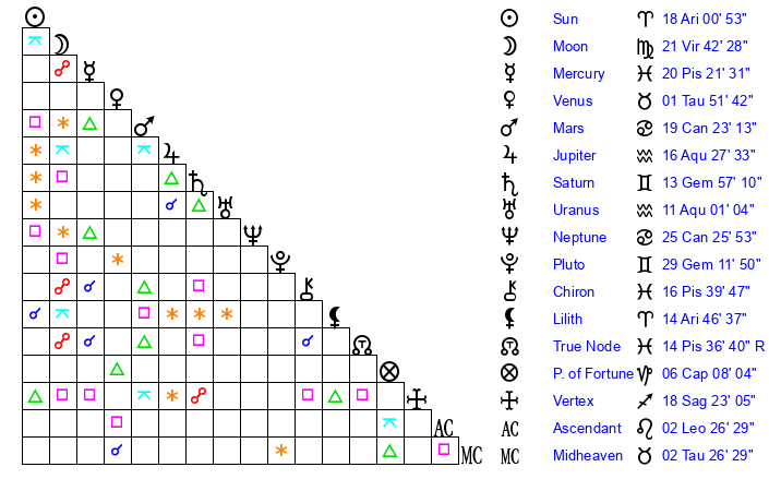 | Sun | 18 Aries 1 | 19 Aries 6 | 4 Leo 44 |