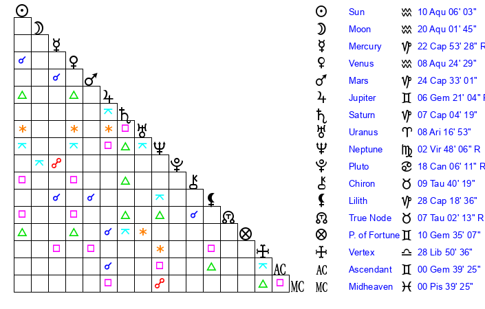 | Moon | 20 Aquarius 4 | 26 Aquarius 25 | 14 Leo 37 |