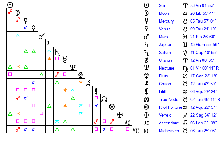 | Sun | 23 Aries 2 | 24 Aries 1 | 24 Cancer 22 |