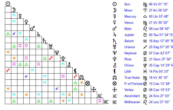| Venus | 21 Virgo 31 | 6 Leo 0 | 19 Aquarius 32 |