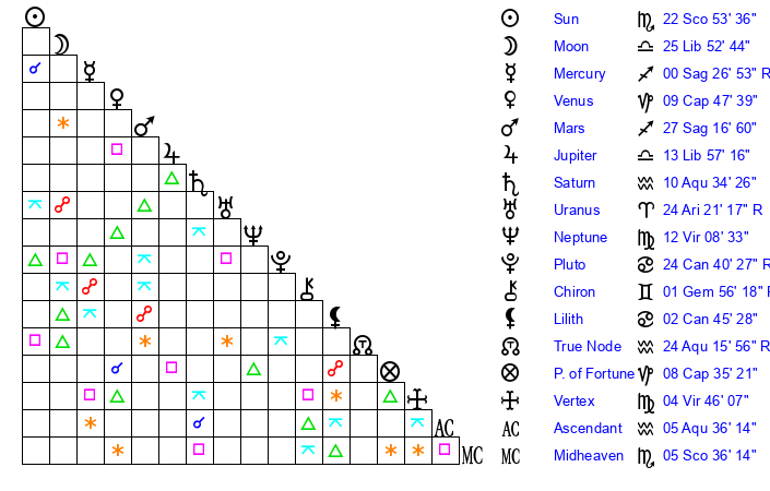 | Moon | 25 Libra 51 | 3 Libra 37 | 19 Pisces 2 |