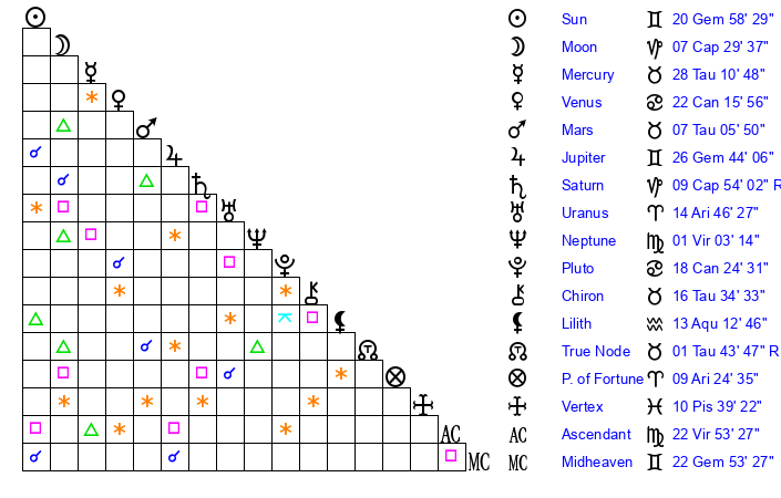 | Sun | 20 Gemini 59 | 21 Gemini 58 | 22 Virgo 7 |
