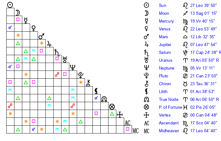 | Sun | 27 Leo 39 | 28 Leo 53 | 0 Sagittarius 27 |