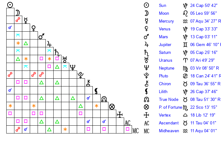 | Venus | 19 Capricorn 34 | 12 Pisces 51 | 17 Taurus 59 |