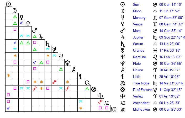 | Sun | 0 Cancer 14 | 1 Cancer 31 | 8 Libra 28 |
