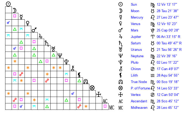 | Neptune | 22 Virgo 40 | 1 Aries 13 | 25 Virgo 18 |