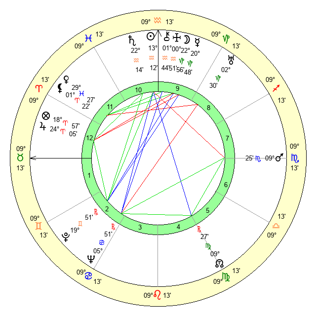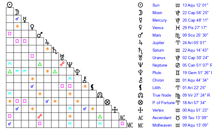 | Sun | 13 Aquarius 12 | 14 Aquarius 5 | 11 Gemini 27 |